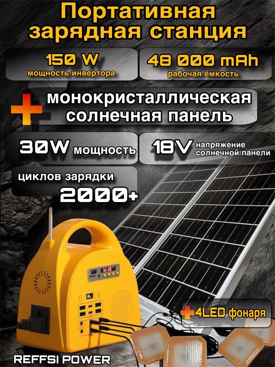 - Reffsi (150 Вт с солнечной панелью) — интересный «всё-в-одном» вариант. Встроенная складная панель, LED-фонари, радио и блютуз-колонка. Компактный корпус и небольшая цена делают его популярным среди рыбаков и любителей лёгкого кемпинга.